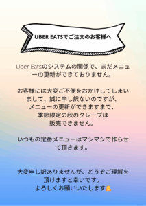 2025.09.18 ウーバーイーツでご注文のお客様へ お詫び ウーバーイーツでご注文のお客様へ メニューの更新ができますまでは、秋の季節限定のクレープは販売できませんことを心よりお詫び申し上げます。 秋の季節限定クレープメニューのお知らせ 前の記事 ウーバーイーツでご注文のお客様へ② 次の記事