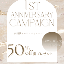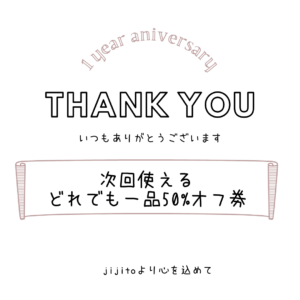 10/2(木)~10/4(土)までの期間中にご来店のお客様に券をお配りいたしますので、次回ご来店の際にご持参いただきますと、お好きな商品をどれでもお一つ50%オフとさせていただきます。