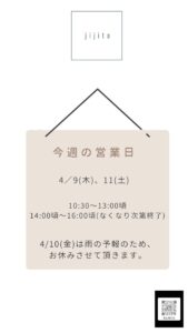 今週は4/9(木)、11(土)が営業日とさせていただきます。