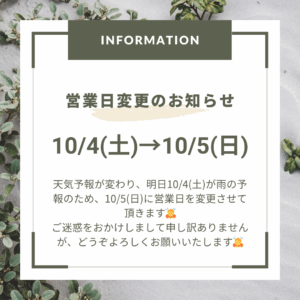 天気予報が変わり、明日10/4(土)が一日中雨の予報のため、10/5(日)に営業日を変更させていただきます。