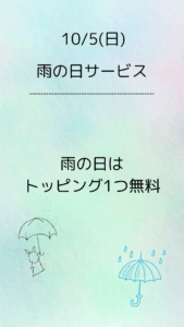 本日は雨のためトッピング一つ無料とさせていただきます。