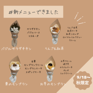 今週9/18(木)からスタートする秋の季節限定クレープメニューのお知らせをさせていただきます。